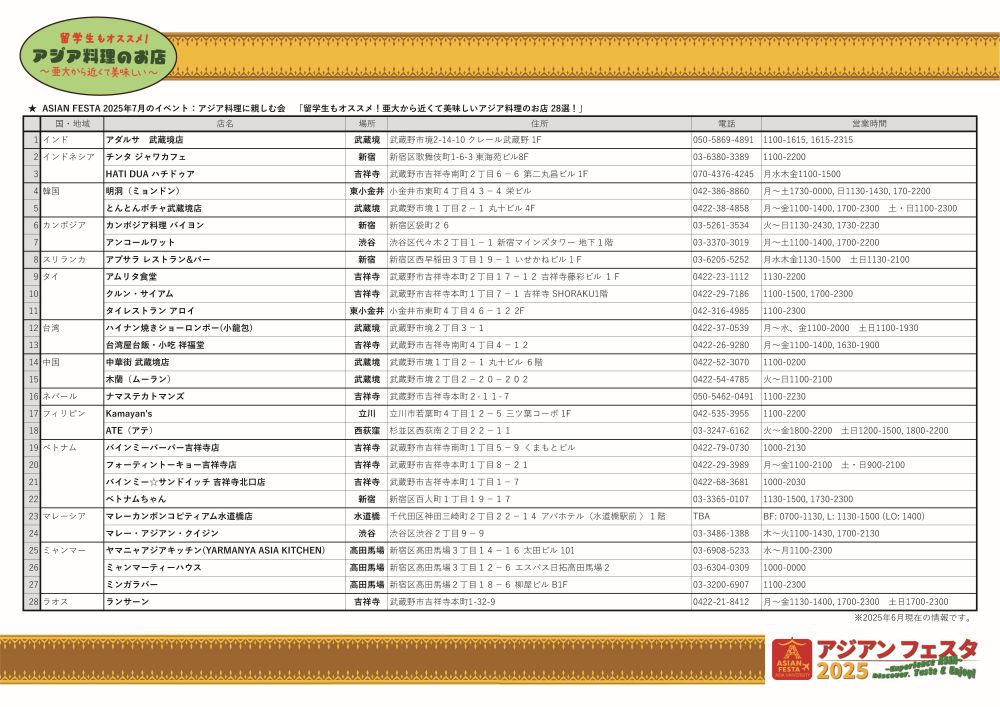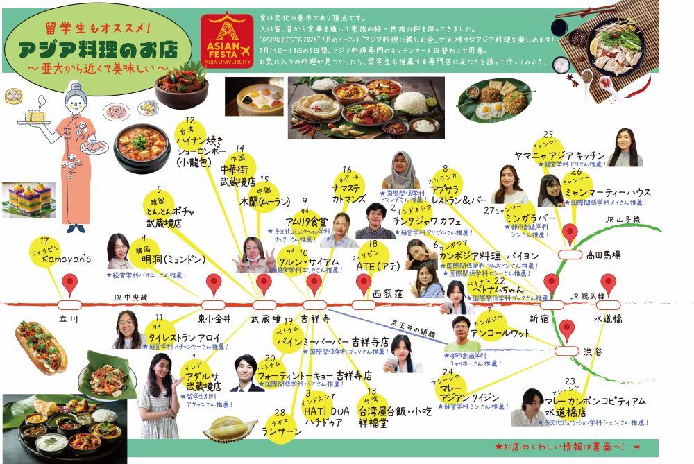 亜細亜大留学生もおススメ!アジア料理のお店 シェアする Tweet 亜細亜大学 留学生がおススメするアジア料理のお店! 亜細亜大学より素敵なマップをいただきましたので、皆様にもご紹介させていただきます! 本国の方のおススメ店が盛り沢山!皆様もぜひご参考ください。 ※2025年6月現在の情報です。 ※PDF表面・PDF裏面 はこちら