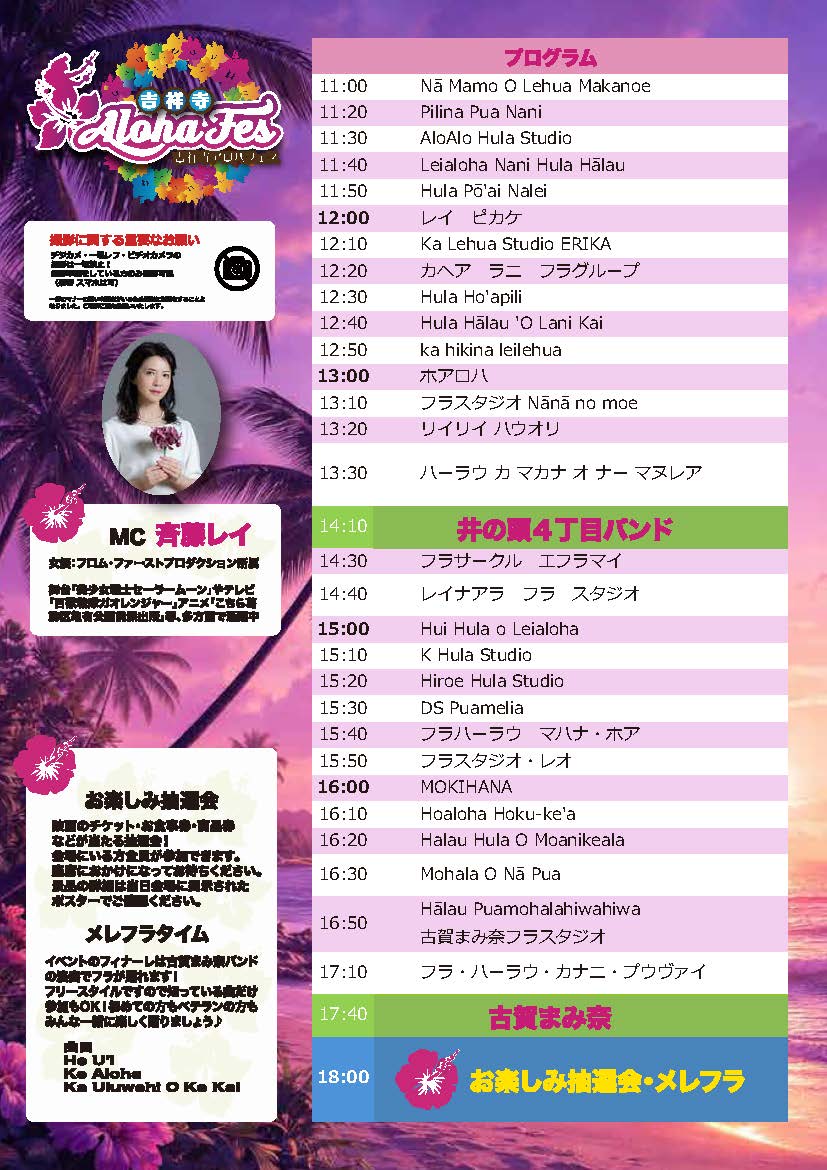 お楽しみに抽選会や古賀まみ奈バンド演奏でフラが踊れるメレフラタイムも♪