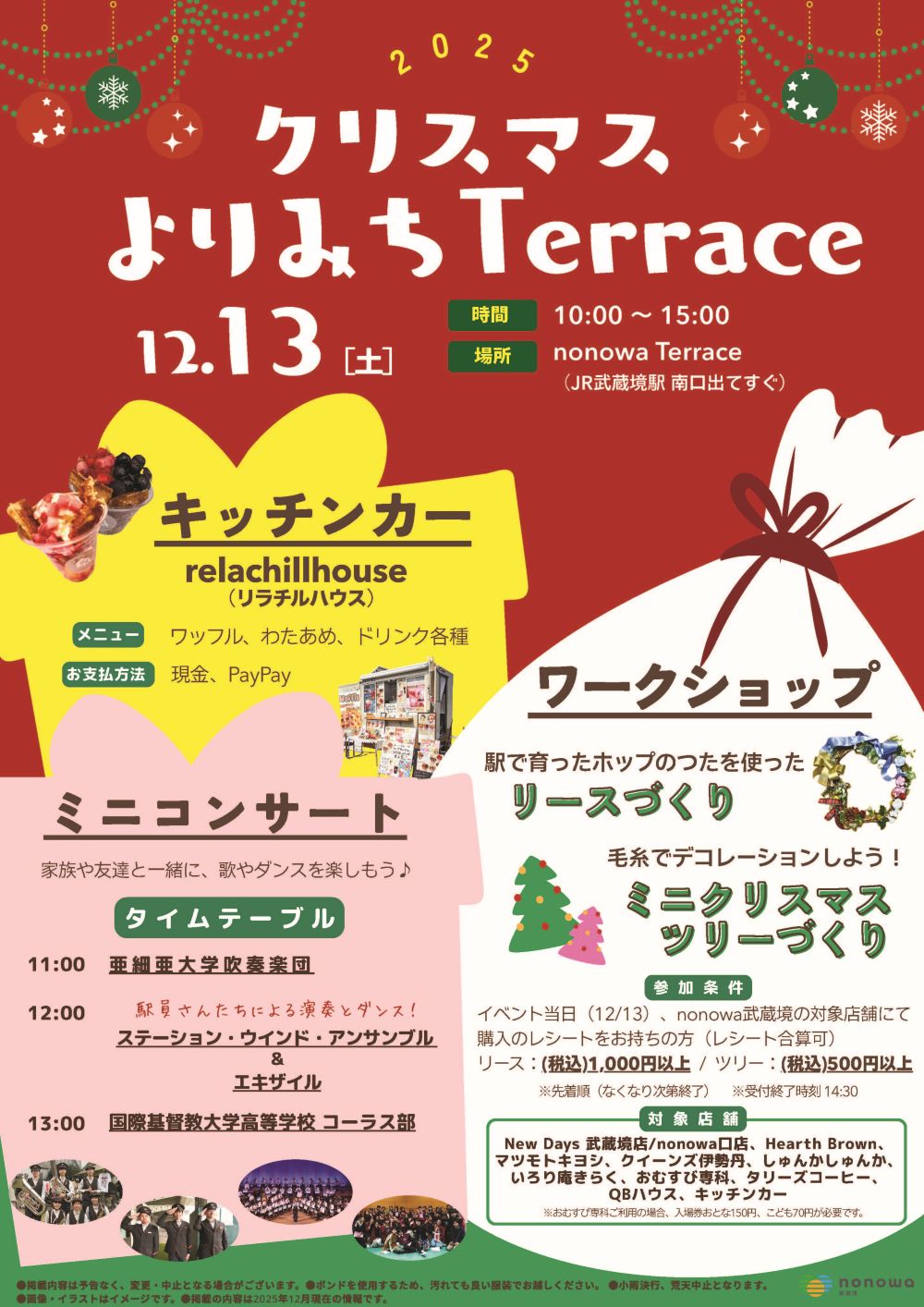 キッチンカーにミニコンサート、リースづくりやミニクリスマスツリーづくりのワークショップも開催されます!お誘いあわせの上、ぜひご来場ください。