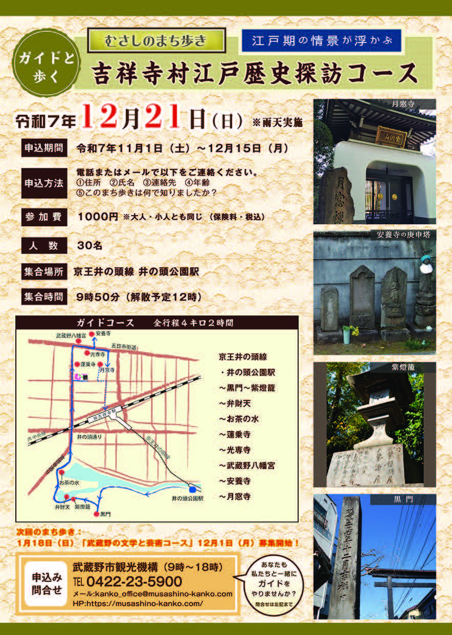 「2025年12月21日 むさしのまち歩き 吉祥寺村江戸歴史探訪コース 参加希望」とお伝えください