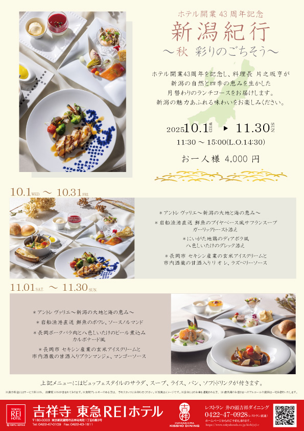 吉祥寺東急REI ホテルでは レストラン「井の頭 吉祥ダイニング」 にて 「 新潟紀行 秋 彩りのごちそう 」を開催 いたします。